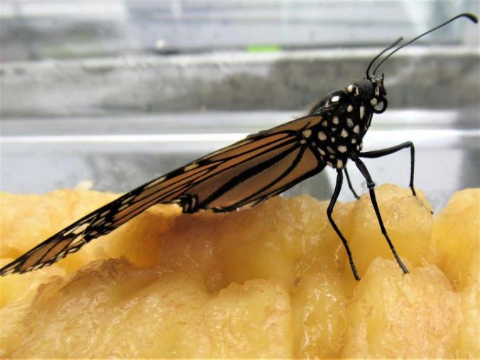 Monarch Butterfly feeding on decomposing banana — Photo by Jan Logozzo © 2017; taken at the Butterfly House, Cape Cod Museum of Natural History