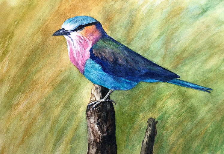 Unofficially known as the national bird of Kenya, the colorful Lilac Breasted Roller inhabits much of eastern and southern Africa and is often found surveying the area for prey from its perch on a dead tree or stump. — Watercolor painting of Lilac Breasted Roller by Mary O’Connor, created from photo taken while on safari in Tanzania, Africa.