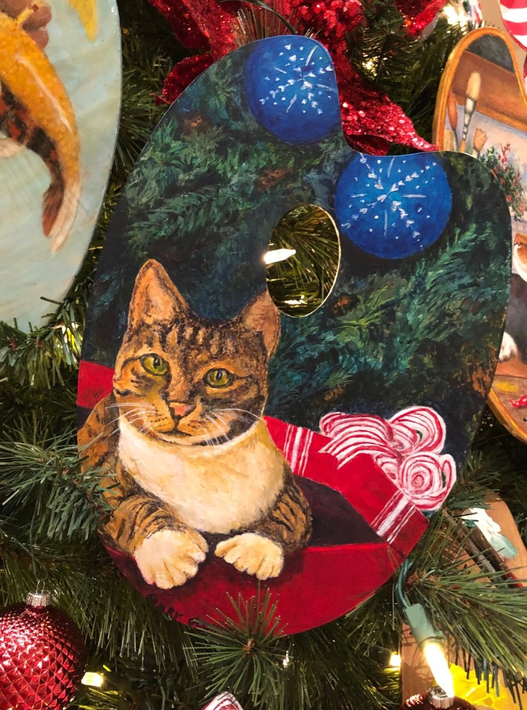 FGM docent and artist, Mary O’Connor, chose the theme of “Surprise!” for her palette, featuring a mischievous cat hiding in a holiday giftbox to reflect Miss Florence’s love for the many cats residing in her house.