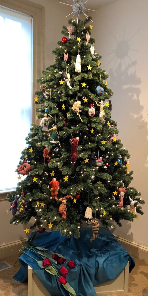 Typically known for her faux and decorative paintings, Old Lyme (Conn.) and Nantucket (Mass.) artist, Robin Breeding, pays tribute to Surrealism art in this 2018 holiday tree at the Florence Griswold Museum. Miniature handsewn mixed media ornaments represent key images found in paintings by female artists studying at Yale University during the height of the Surrealism era.
