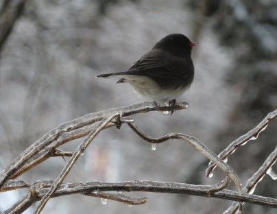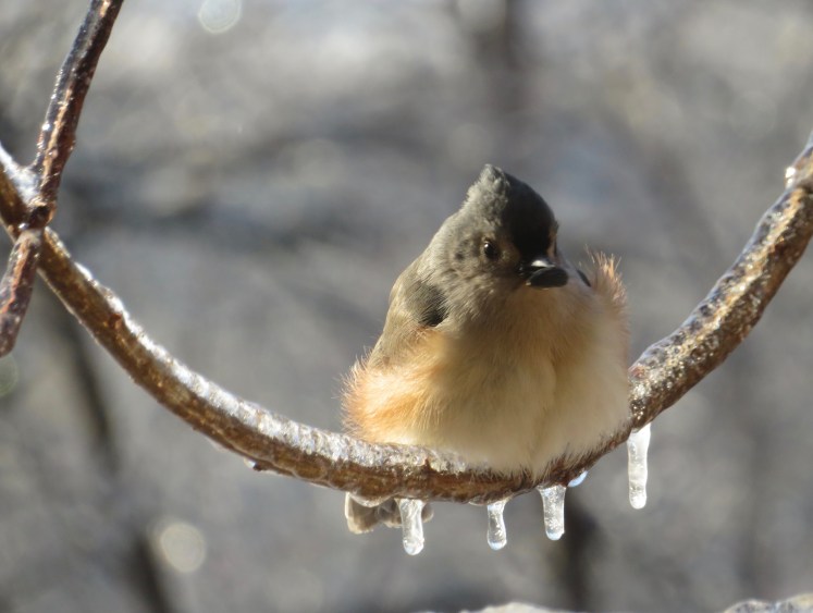 Very cold Titmouse huddles to stay warm; Junco stands tall in the cold — Photos by Bivenne Harvey Staiger