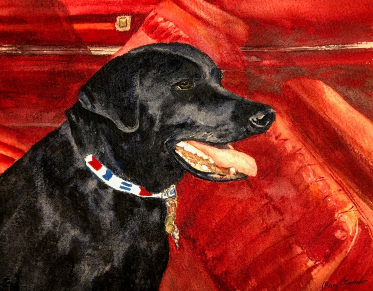 Zoe, whose name means “life” in Greek, enjoyed life to the fullest with her family, Joe, Lori, Alex and Andrew. Whether fetching a ball, enjoying a top-down ride in the family Cadillac, or just plain lying companionably at one’s feet, Zoe exuded love, loyalty and happiness. — Watercolor painting of Zoe by Mary O’Connor. Click here to visit Mary’s gallery of pet portraits.
