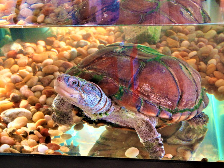 Squirtle ~ An African Sideneck Turtle, Squirtle views the world through the glass walls of her watery aquarium home. With necks that are longer than most turtles, Sidenecks can’t completely hide their heads in their shells. Instead, as its name infers, it tucks its head under the edge of its shell after drawing its head to the side. Thanks to a face often described as adorable and smiling, African Sidenecks such as Squirtle are popular pets.