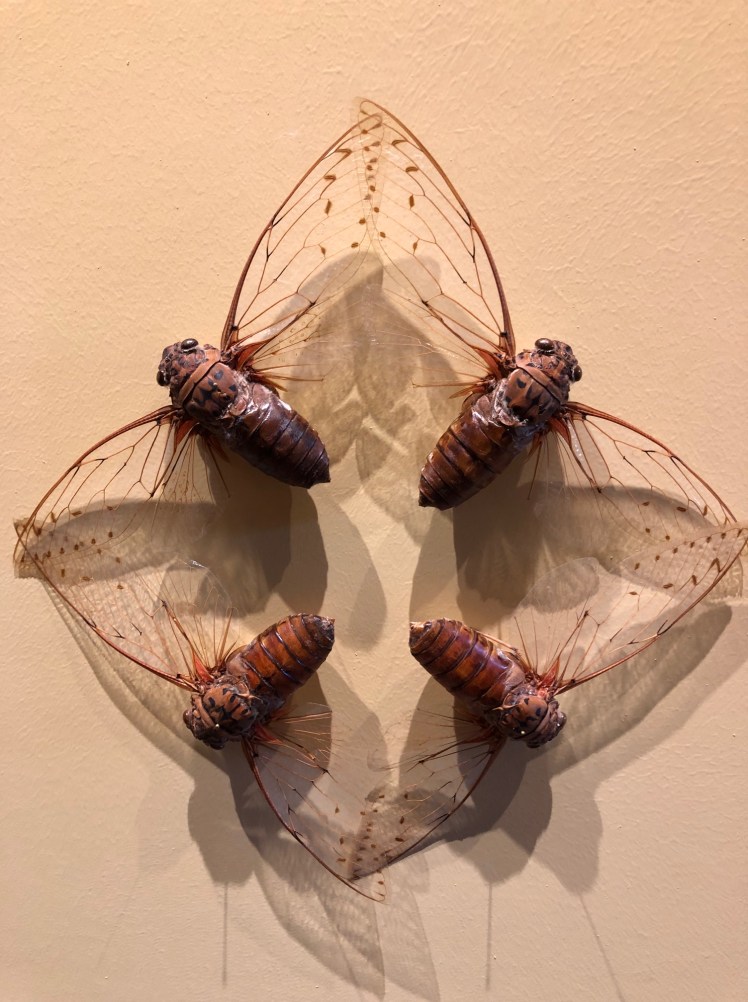 Magic Cicadas ~ Known for her creative installations using large numbers of insects arranged in ornamental patterns, University of Wisconsin professor of design Jennifer Angus anthropomorphizes insects in the hope that she can create interest in the role that insects play in ecosystems. Her Silver Wings and Golden Scales exhibit may be seen at the Florence Griswold Museum, Old Lyme, Conn. through November 10.