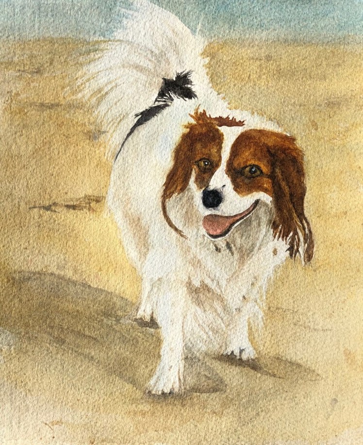 Moose, a mix of Cavalier King Charles Spaniel with a suspected touch of Pomeranian, totally lives up to the Cavalier reputation as contender for the title of “top tail-wagger.” Adopted and thoroughly loved by Mara and her family, Moose will melt your heart with his warm eyes and seemingly smiling expression! ~ Watercolor painting by Mary O’Connor