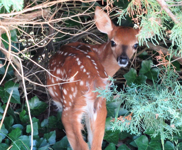 Venturing Out ~ Tiny fawn peeks from sheltering cover • Photo by Jan Logozzo