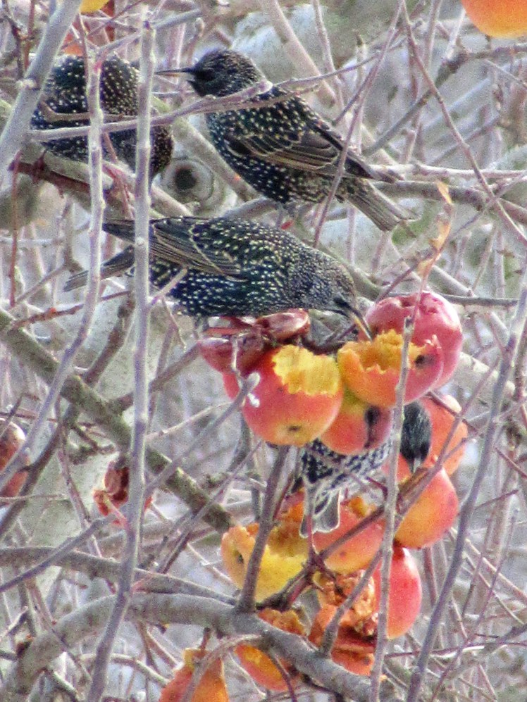 Meal Enjoyed ~ Flock of starlings, in their winter garb, enjoy remains of autumn orchard harvest. Photo by Jan Logozzo • “Feast” haiku by Mary O’Connor
