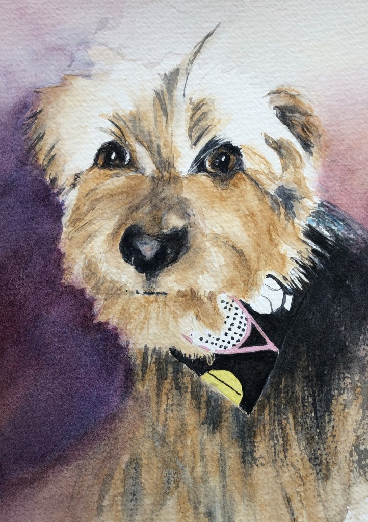 Rascal ~ Appropriately named, little Rascal, a Norfolk Terrier, brings nothing but big smiles to those who love him • Watercolor painting and “Mischief” haiku poem by Mary O’Connor