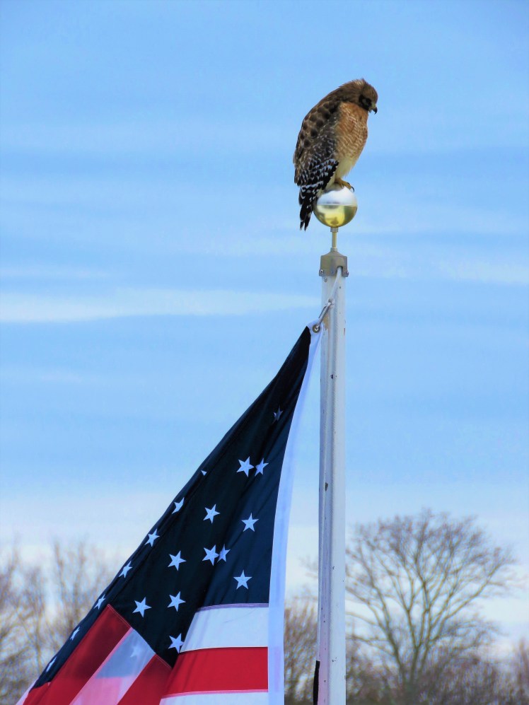 American Dream ~ Red-shouldered Hawk chooses best seat in the house • Photo and “American Dream” Haiku poem by Mary O’Connor