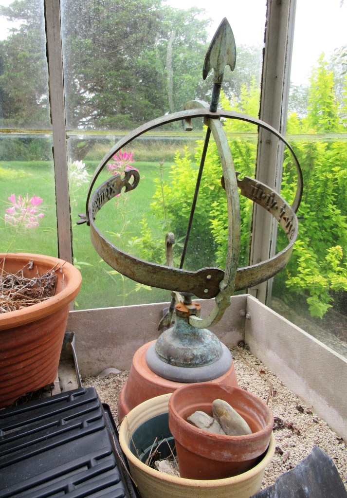 Old Sundial ~ Armillary sundial sits in garden potting shed ready to measure time by passing of shadows • Photo and “Passing Shadows” haiku poem by Mary O’Connor