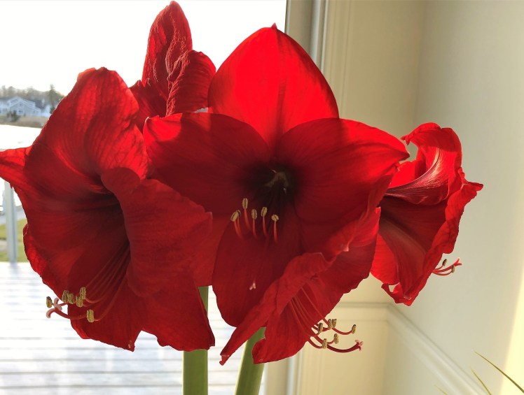 Shining Through ~ Red Lion Amaryllis in full bloom • Photo and “Tranquility” haiku poem by Mary O’Connor