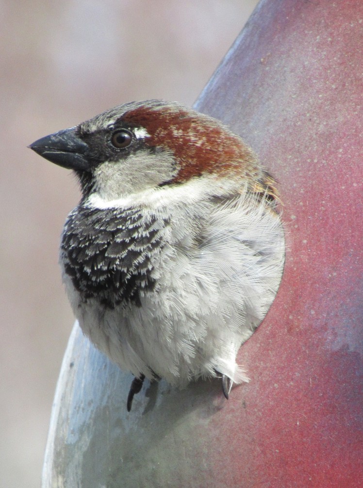 All puffed up ~ Tiny house sparrow fills doorway to nest • Photo by Jan Logozzo • “Puffed Up” haiku by Mary O’Connor