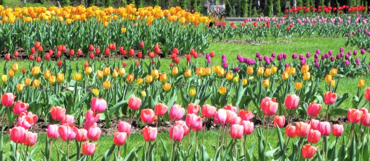 Row upon Row ~ Tulips in full bloom, Elizabeth Park, West Hartford, Conn. Photo by Jan Logozzo • “Bandwidth” haiku poem by Mary O’Connor