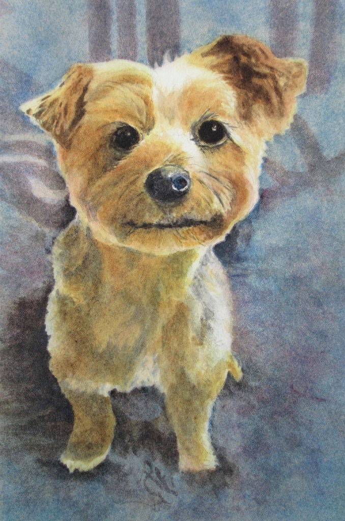 Saved ~ Having traveled from Houston (hence his name) to Boston, Yorkie-mix Houston loves his new “forever home.” • Watercolor painting and “Rescued” haiku poem by Mary O’Connor
