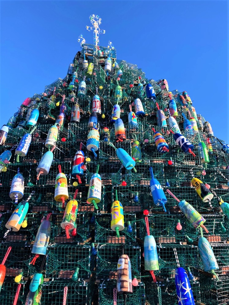Lobster Pot Tree ~ What else would the Borough of Stonington, Conn., do with all its lobster pots than build a Christmas tree on the town dock? Some 330 pots, custom painted buoys and strings of colored lights all add up to a 25’ tall tree with an anchor topper. • “Holiday Decorations” haiku poem and photos of tree, buoys and an inside construction perspective by Mary O’Connor