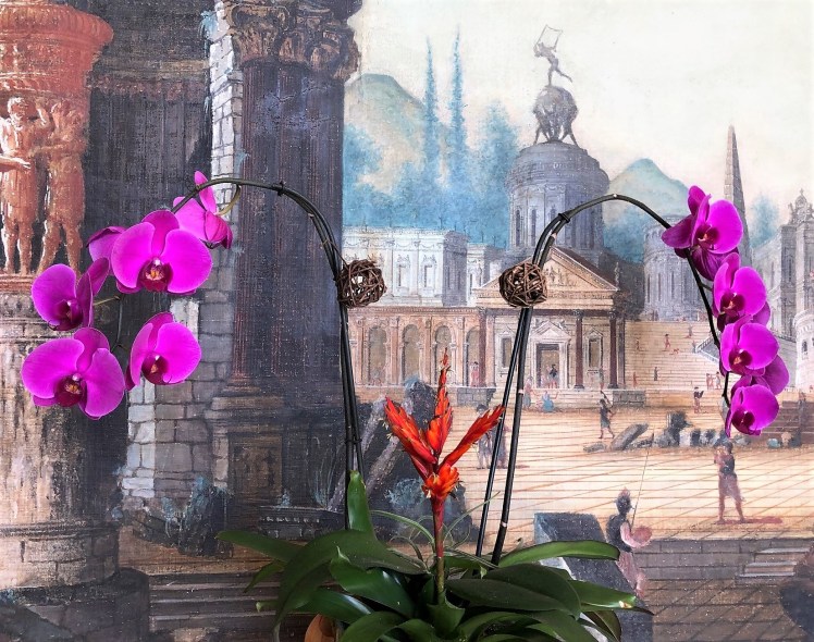 Juxtaposition ~ Orchids bring life to classic mural background • Photo of a Passing of Time wall painting in the Vizcaya Museum and Gardens, Miami, Florida, and “Connections” haiku poem by Mary O’Connor