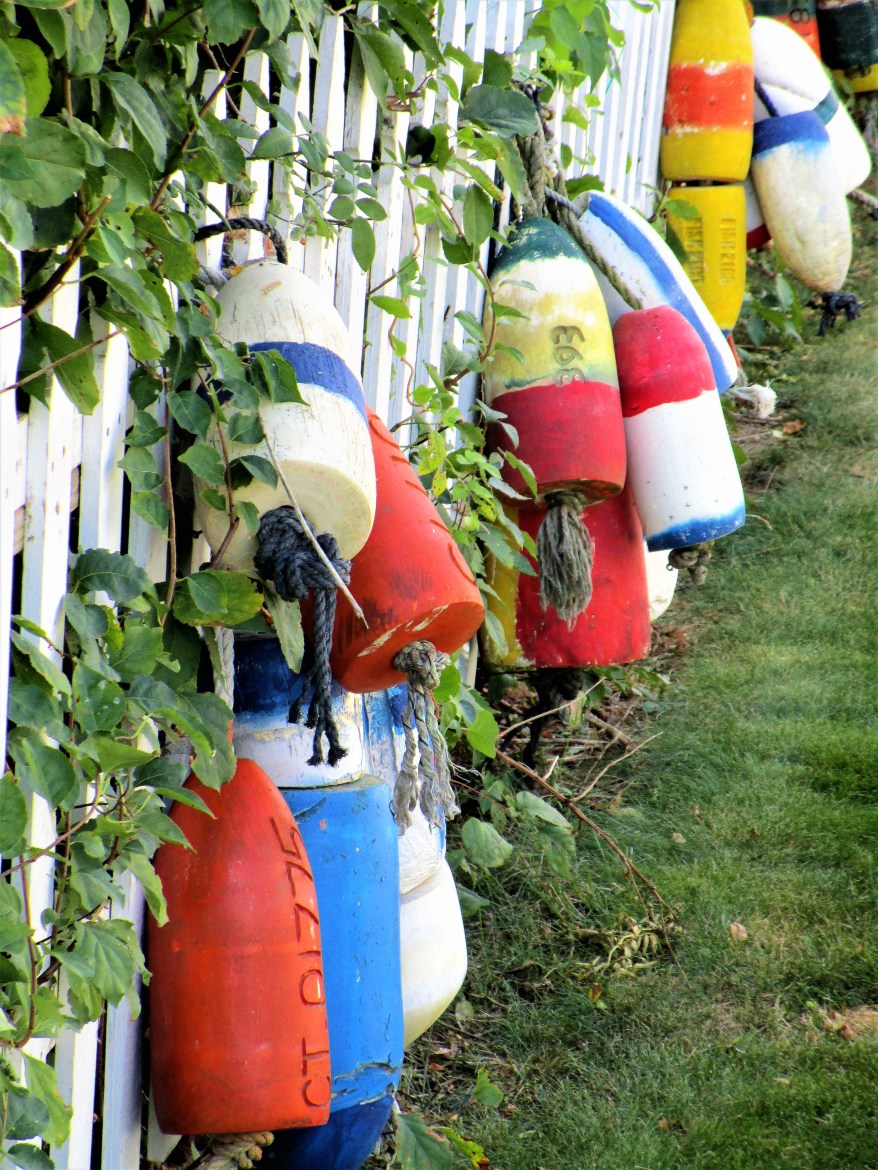Buoys at Rest ~ Lobster Pot Buoys • Photo by Jan Logozzo • “Off-duty” haiku poem by Mary O’Connor