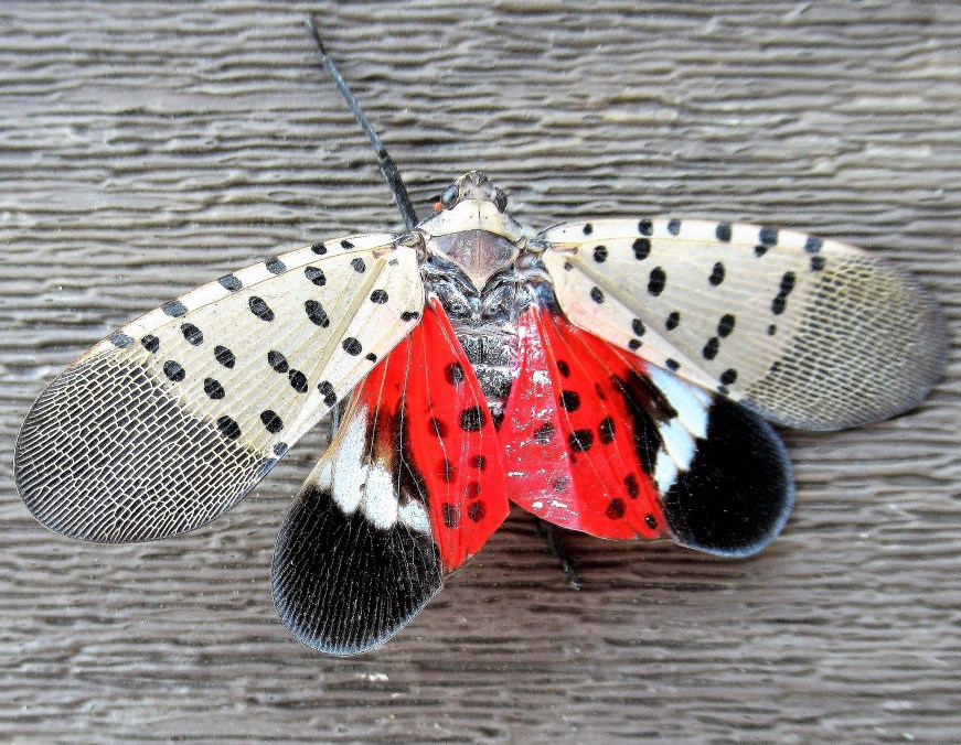 Pretty Predator ~ An invasive planthopper that made its way to the U.S. from China, the Spotted Lanternfly damages crops and ornamental plants, including grapevines, blueberry bushes, and walnut, oak, and apple trees • Photo by Jan Logozzo • “Lantern Light” haiku poem by Mary O’Connor