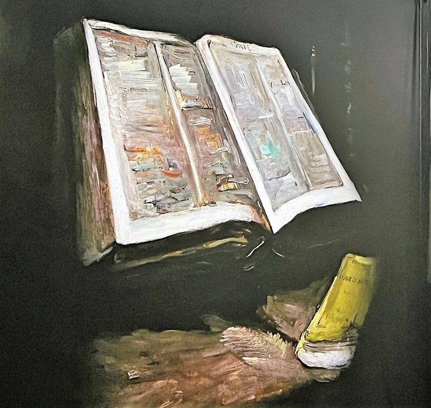 Still Life with Open Bible ~ In this 1885 painting, said to symbolize the different views of the artist and his father, Vincent Van Gogh paints a heavy and huge bible, open to Isaiah, 53, with its “man of sorrows and grief” passage. The other book is lighter and well-thumbed, Emile Zola’s Joie de Vivre • “Open Book” haiku poem and photo of projected image of “Open Bible” painting shown in the Immersive Van Gogh traveling Exhibition, by Mary O’Connor