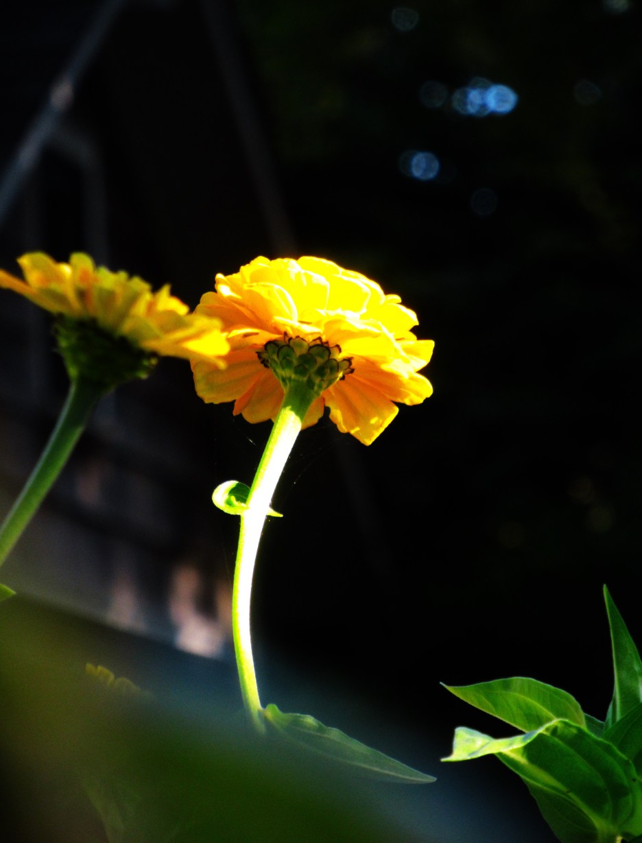 Nighttime Light ~ Golden Zinnia blossom a beacon in the dark • Photo and “Darkness” haiku poem by Mary O’Connor