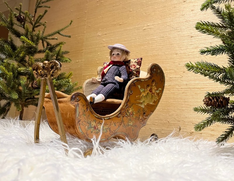 Winter’s Charm ~ Though the white and drifted snow, Victorian toy doll and sleigh make their way through the halls of the Florence Griswold Museum, Old Lyme, CT • Photo and “Magical Fun” haiku poem by Mary O’Connor