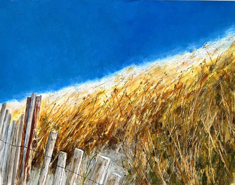 Bank Deposit ~ Summer sun deposits gold on sand bank • Acrylics painting and “Sunstruck” haiku poem by Mary O’Connor