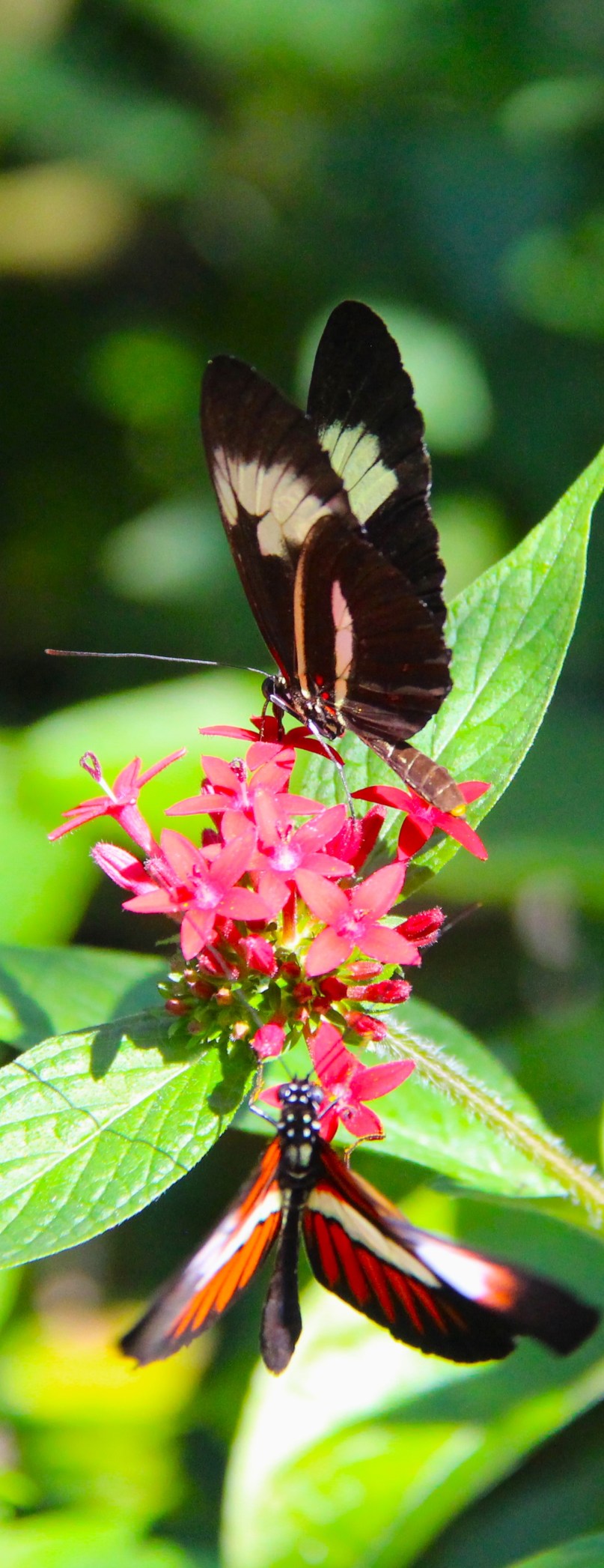 Easy Access ~ Star Cluster plants with their shallow blossoms provide easy access for visiting butterflies’ probiscus. Heliconius melpomena (top) and heliconius egeria, display their brightly colored wings with splashes of red, orange and white on black backgrounds • Photo at Butterfly World by Jan Logozzo • “Engaging” haiku by Mary O’Connor