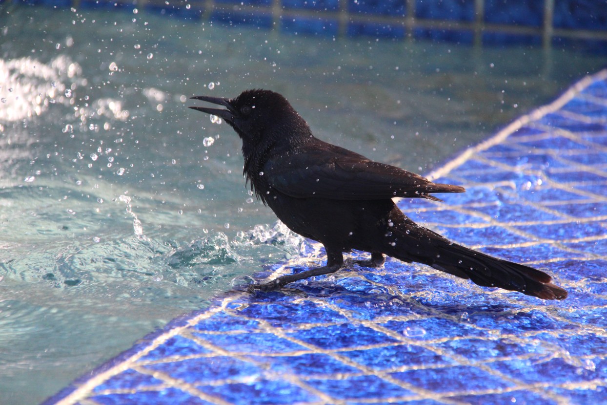 Cooling Drops ~ Florida’s Boat-tailed Grackle enjoys fountain’s cool splash • Photo by Jan Logozzo • “Shiny Jewels” haiku poem by Mary O’Connor
