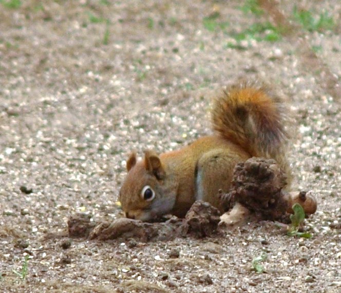 “Where did I put that?!” ~ Red Squirrel digs for buried treasure • Photo by Andrew Finn • “Digging Deep” haiku poem by Mary O’Connor