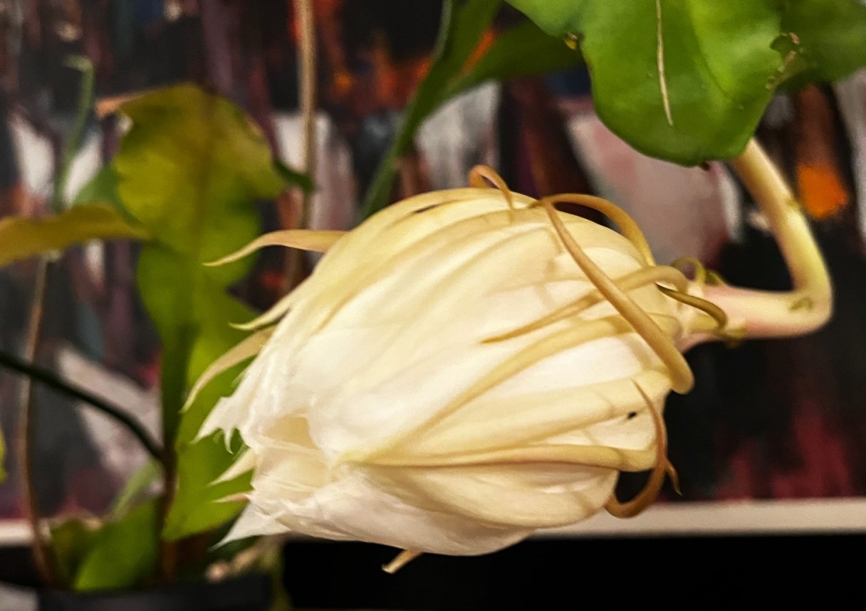 Time Lapse Study ~ Night-blooming cereus draws crowds to watch its single bud slowly open just once a year, living just for hours • Photos and “Time Lapse” haiku by Mary O’Connor