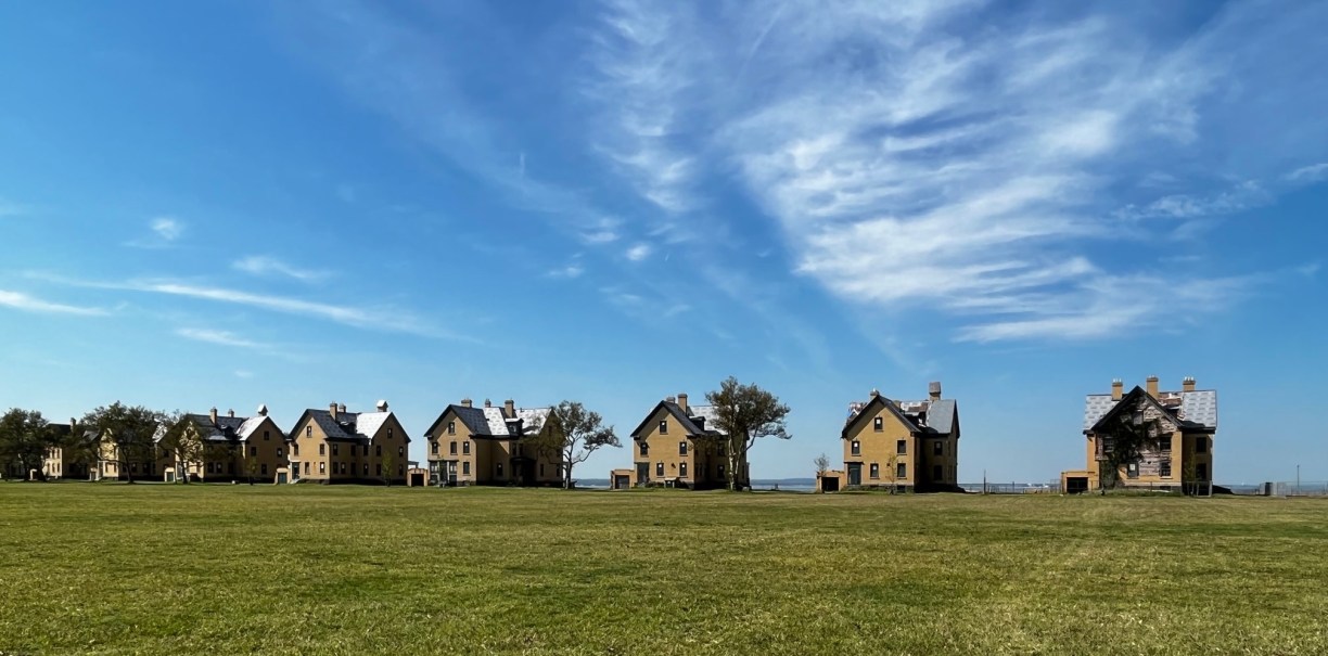 18 yellow brick Fort Hancock Officer’s Row buildings stand silently overlooking Sandy Hook Bay. Once the outermost defense for New York Harbor, Fort Hancock with its 100+ buildings and 12 gun batteries was deactivated in 1974 • Photo by Jan Logozzo • Blog post and “Retirement” haiku poem by Mary O’Connor