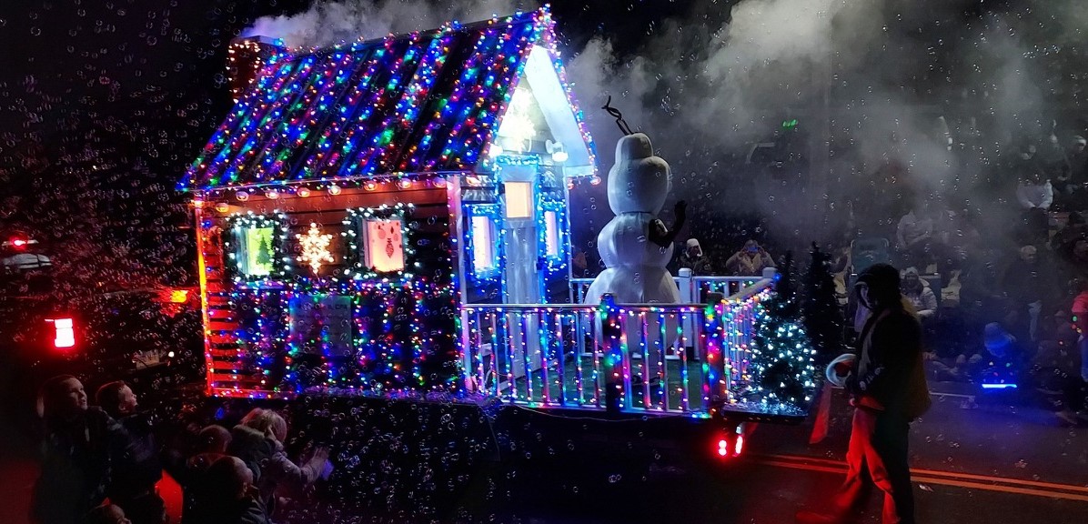 Season’s Atmosphere ~ Frosty signatures fill air around Niantic Light Parade float • Photo by Jan Logozzo ٭ “Frosty Spirits” haiku and blog by Mary O’Connor