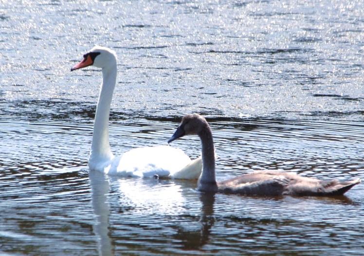 Envisioning ~ “This is what I will look like!” says the dusky brown-gray feathered cygnet, swimming beside the beautiful white-feathered adult swan • Photo of Mute Swans by Jan Logozzo • “Envision” haiku by Mary O’Connor