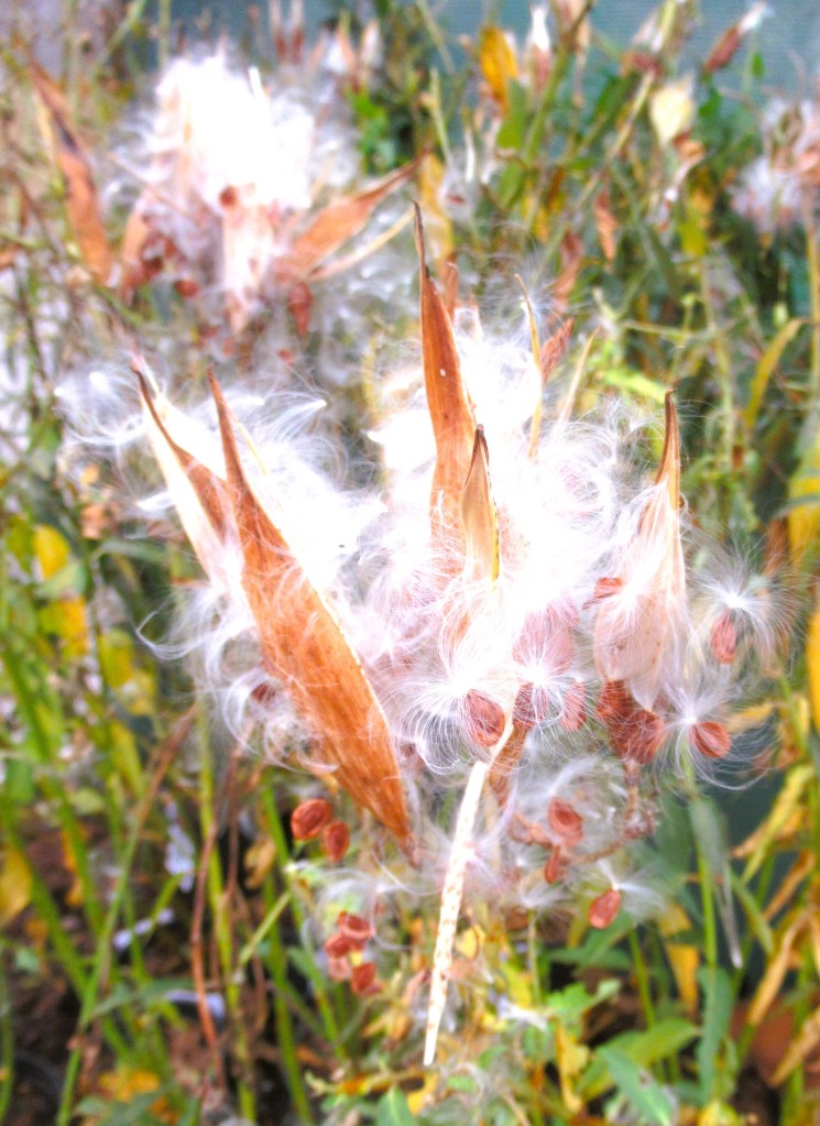 Silky strands of milkweed fiber drift from burst pods. Naturally buoyant and water repellent, milkweed floss was valued during World War II to fill life jackets for soldiers. Two 20-pound bags of milkweed pods made one protective jacket • Photo by Jan Logozzo • “Lightweight Power” haiku by Mary O’Connor
