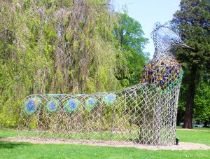 Well over six feet tall, the Sandhill Crane on the Blithewold estate lawn is a standout presence in its own right, not to be outdone by a simply extraordinary peacock with its iridescent feathers • Sculptures by Donna Dodson and Andy Moerlein • Photos by Jan Logozzo • “Extraordinary” haiku by Mary O’Connor