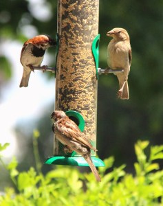 Places set for three, neighborhood feathered friends share table talk and seeds of the day • Photo by Jan Logozzo • “Table Talk” haiku by Mary O’Connor