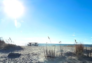 Sunbathers gone, warm sands of beach reduced to footprints • “Winter Light” haiku and photo by Mary O’Connor