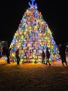 Built with lobster traps and 460 hand-painted buoys, the Stonington (CT) Lobster Trap Tree lights up the town dock in annual tribute to the local fishing industry. Recognized by the BBC as one of the world’s most amazing Christmas trees, the anchor-topped tree reaches 35 ft. into the night sky • Photos by Jan Logozzo • “Holiday Tribute” haiku by Mary O’Connor