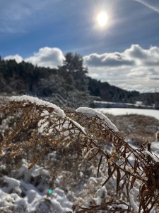 Covered with snow, buried net becomes frozen tapestry of nature • Photo by Terry Logozzo • “Wild Delight” haiku by Mary O’Connor