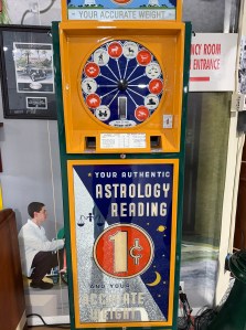 Astrology reading machines, popular in the Fifties and Sixties, were coin-operated arcade, boardwalk, and grocery store novelties. They used rotating dials, illuminated signs, or animated figures to dispense printed horoscopes or fortunes for a penny, dime or nickel.