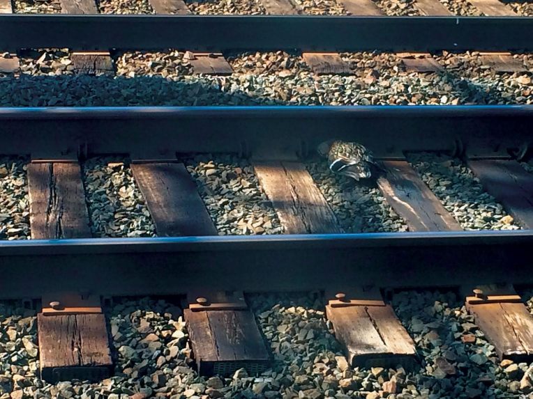 Photo of Mallard Duck on tracks in Darien, CT reprinted from Evidence of Flossing: What We Leave Behind by Jennifer Payne © 2017