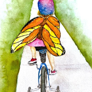 “The quality of strength lined with tenderness is an unbeatable combination.” — Maya Angelou propulsion of wings side wheels sustain dynamics turbo powered fun * * * Unbeatable Mae conquers the road under the propulsion of butterfly wings and red-sneakered pedaling • Watercolor painting and “Turbo Power” haiku by Mary O’Connor © 2025